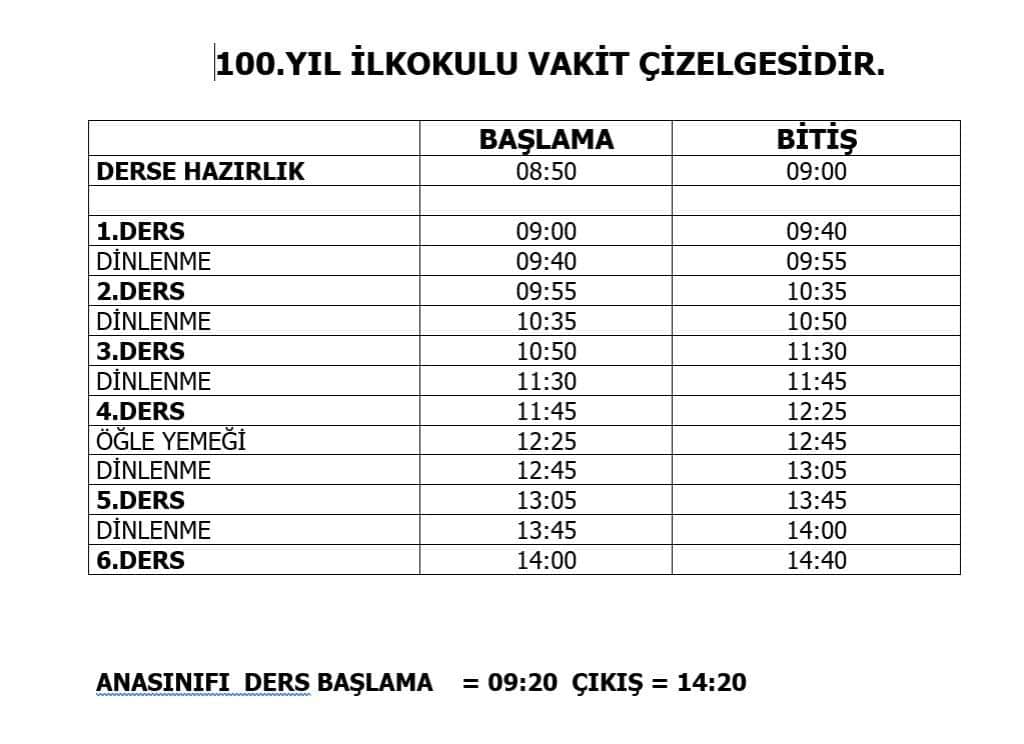 2025-2026 Eğitim Öğretim Yılı Vakit Çizelgemiz